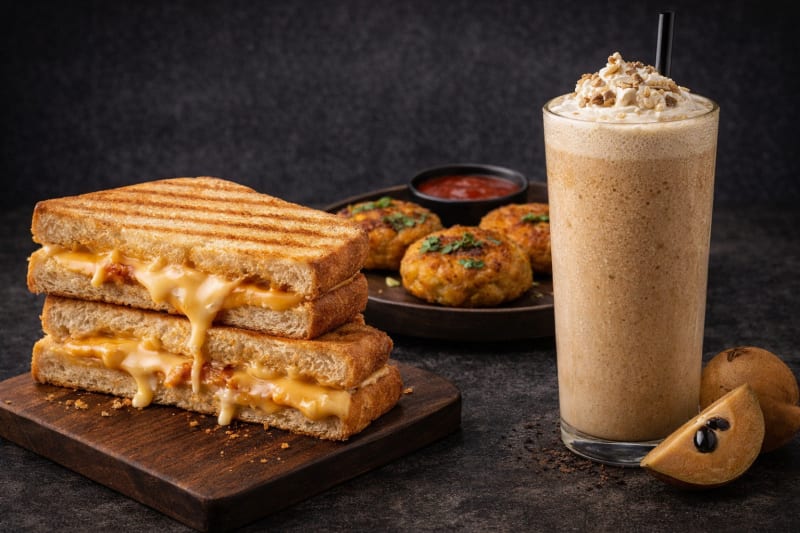 Cheese Grilled Sandwich + Masala Patties + Chikoo Shake — cheesy, crispy & creamy.