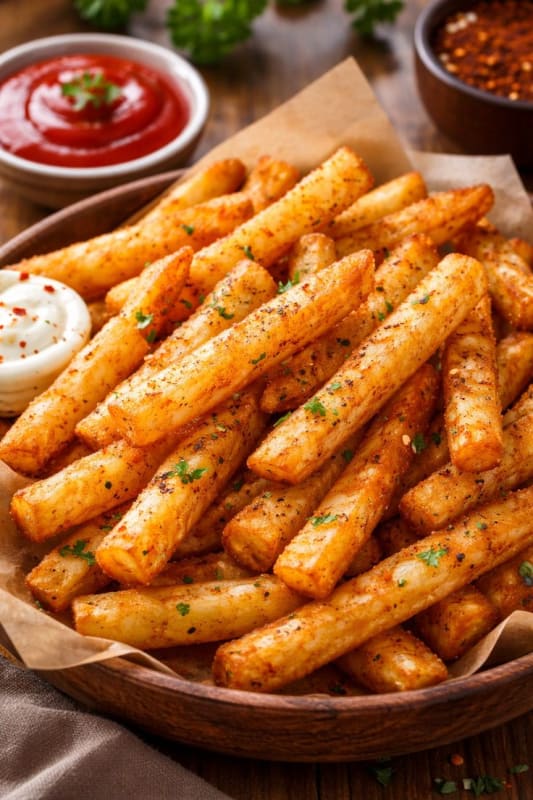 Hot, golden crispy fries dusted with a bold peri peri spice blend that delivers a fiery, smoky, and tangy kick with every bite. For those who love their fries with a serious, addictive spicy edge.