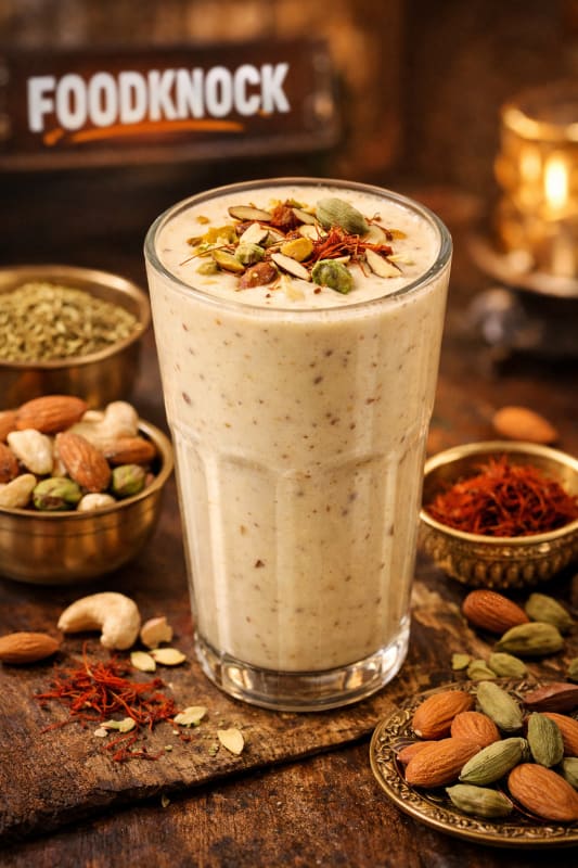 Creamy, chilled Thandai shake with dry fruits & aromatic spices — pure royal refreshment.